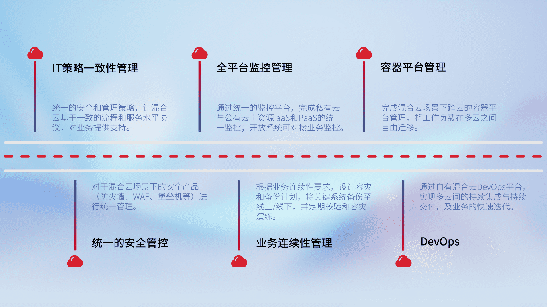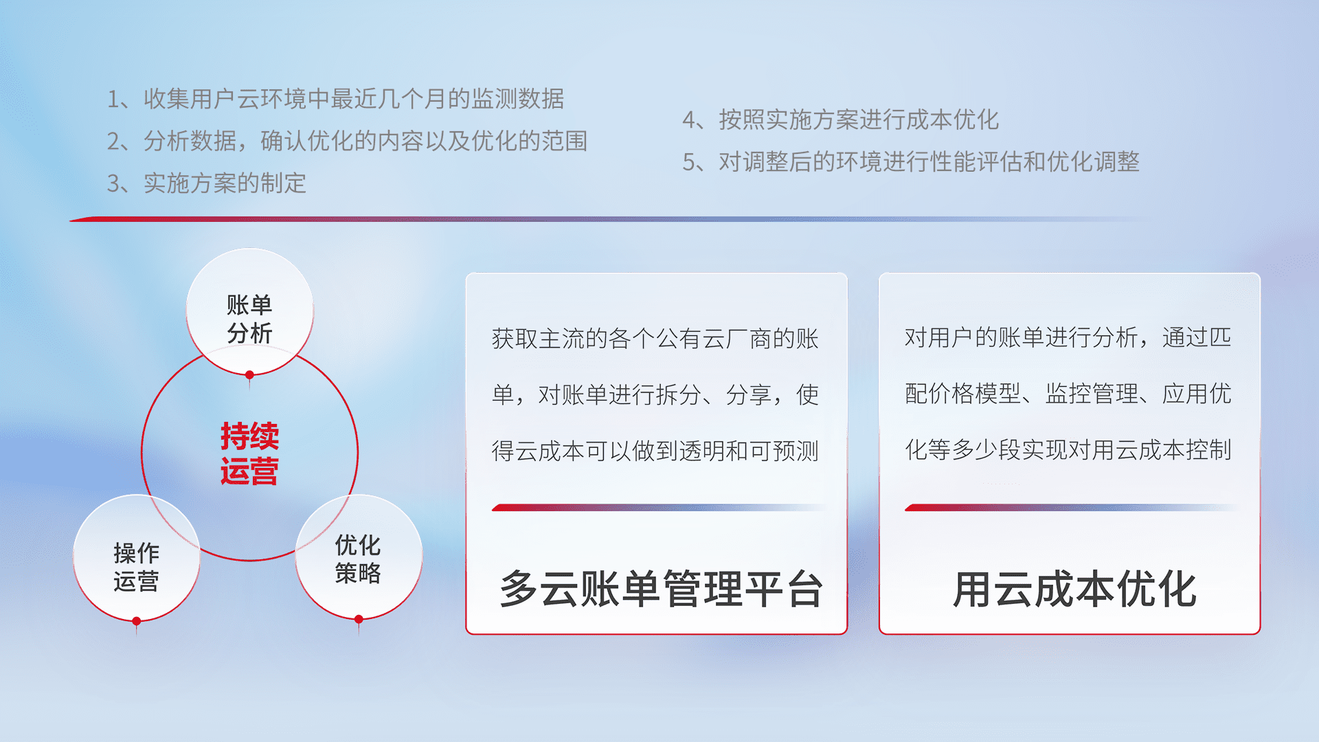 通过多云纳管,,,,以统一的资源数据模型把客户的云资源进行抽象和封装,,,进而实现对多云资源的统一操作,,,,保障云资源管理的可靠性、、、稳定性与可用性。。量身定制化运维内容,,,配置、、、、开发运维、、、补丁管理、、、备份、、、监控、、、、认证和访问管理、、、、审计和日常巡检等,,保障在用云过程中的可靠度,,,,稳定度以及高可用率。。